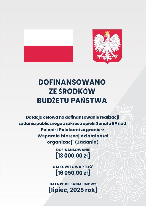 Z wielką radością i przyjemności informujemy, że w roku 2025 we współpracy z Fundacją „Pomoc Polakom na Wschodzie im. Jana Olszewskiego” otrzymaliśmy wsparcie finansowe z dotacji z Kancelarii Senatu w ramach konkursu „SENAT-POLONIA 2025”.